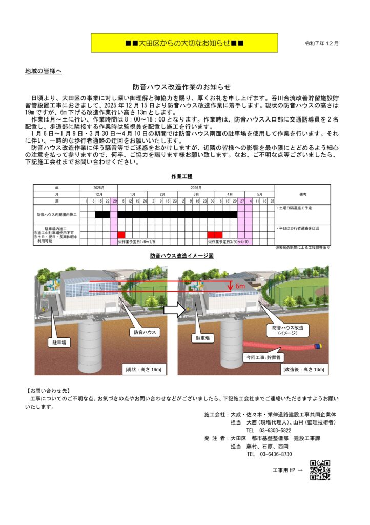 現在東調布公園内で行っている本工事において、2025年12月15日より防音ハウス改造作業に着手しております。