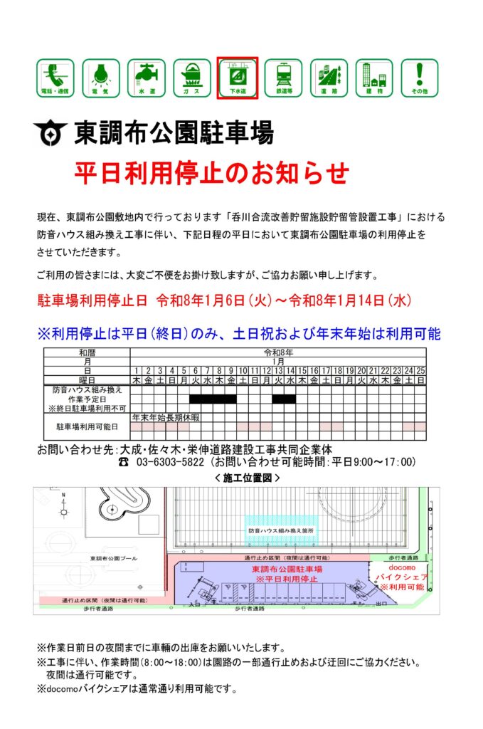 下記日程の平日において、東調布公園駐車場を利用停止いたいします。